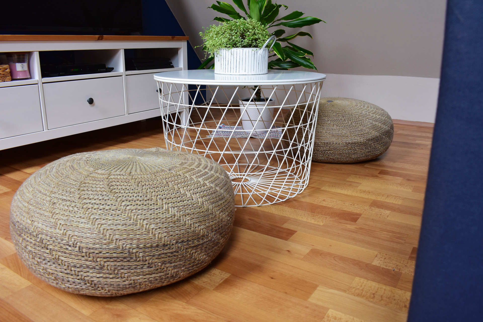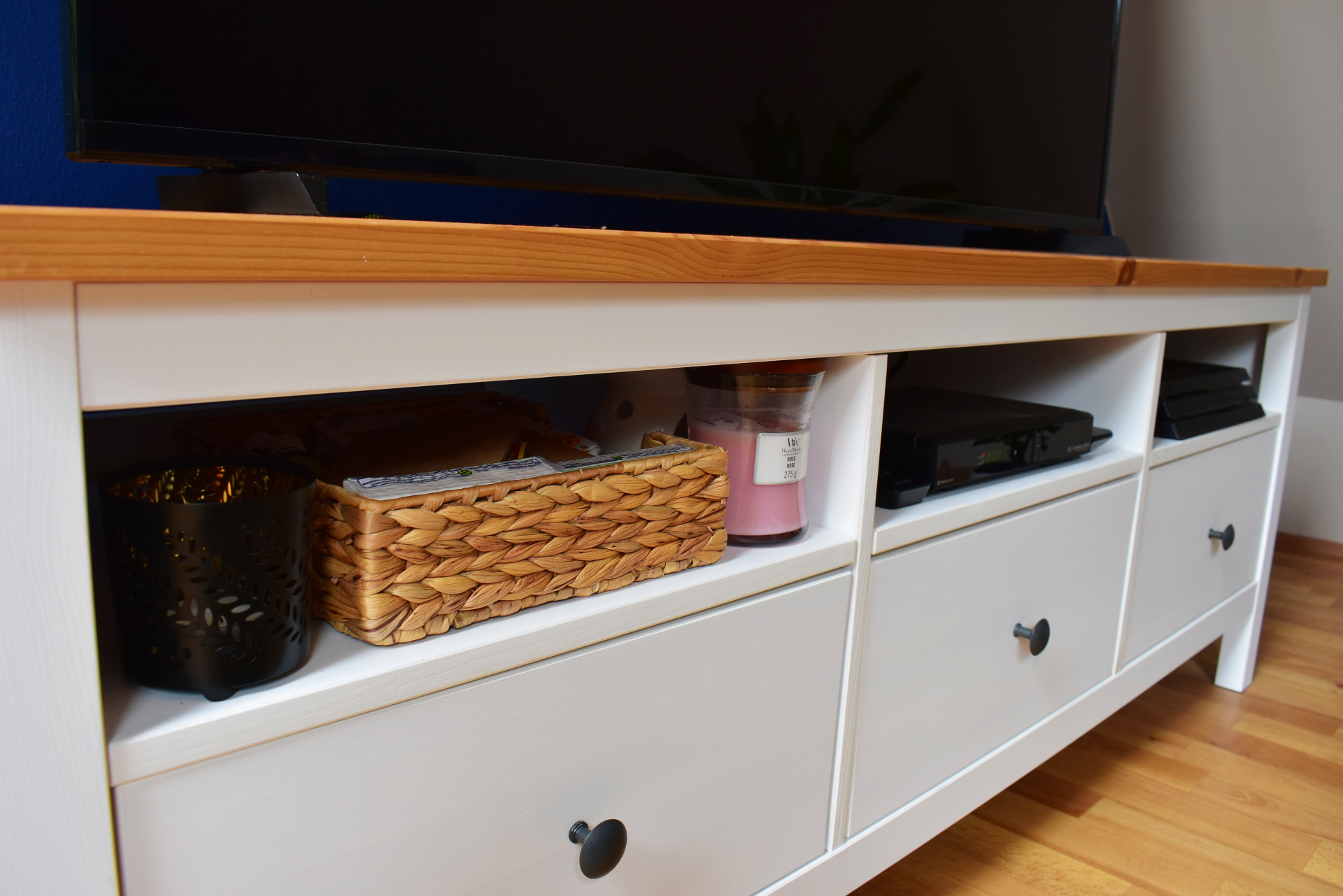 Taburetky bol môj asi najlepší nákup! Pohodlne sa na nich sedí, pravidelne si na nich vykladám nohy a premiestňujem, kde aktuálne potrebujem - skrátka ich zbožňujem! Kúpila som ich spolu s oboma stolíkmi z Ikey. TV stolík je zo série Hemnes. V prvej priehradke mám sviečky a v ostatných techniku. Stredný šuflík je plný sladkostí, ktorý sa vždy veľmi rýchlo minie, keďže je často na očiach. Musím na tieto mini-hriechy nájsť iný priestor 😊.