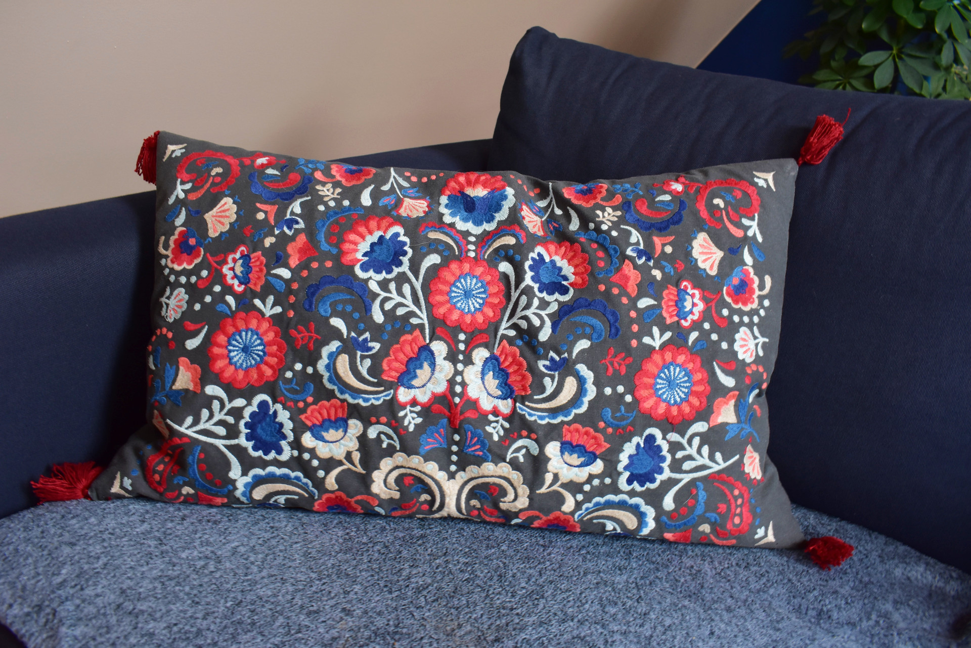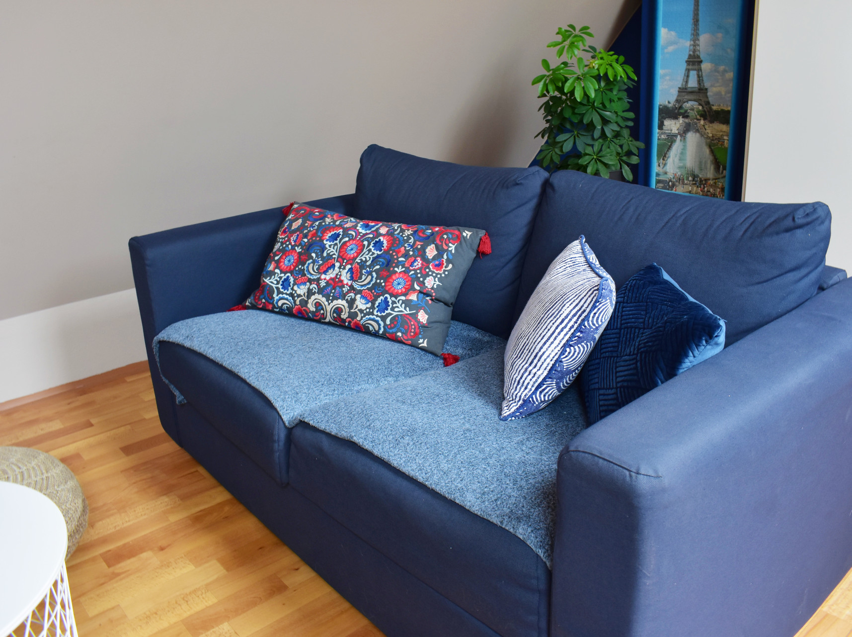 K tejto farbe som doladila aj gauč, ktorý je presným stredom izby a nachádza sa medzi dvoma modrými stenami. Tie sú zmiernené zvyšnými sivo-krémovými stenami. Čo sa týka jeho veľkosti, bola som limitovaná na klasickú dvoj sedačku. Kupovala som ho z Ikey, z ktorej som nemohla odísť bez tohto nádherného vankúša! Je neskutočne pohodlný a nemení tvar!